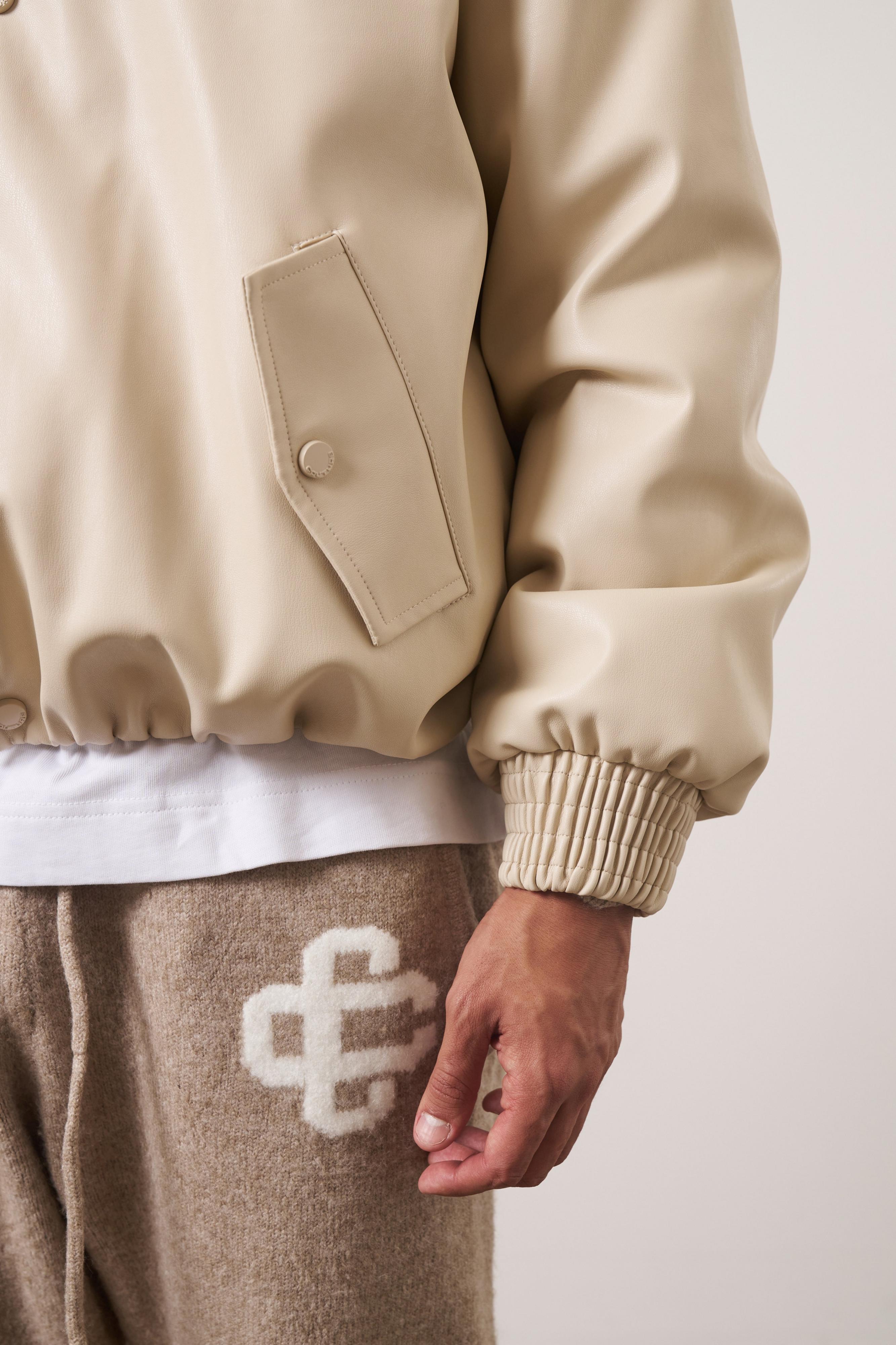 Colour: Beige Details: – Relaxed fit bomber jacket with collar- Faux leather fabric – Branded tonal popper front fastening – Elasticated cuffs – Ruched waistband with internal elastic – Pocket detail with branded popper to front – Metal branded badge below back neck – Soft satin lining with padding – Model wears size M and is 5’11, Chest: 38″, Waist 32 Fabric Composition: Outer – 50% Polyester, 50% PU Liner – 100% Polyester Padding – 100% Polyester