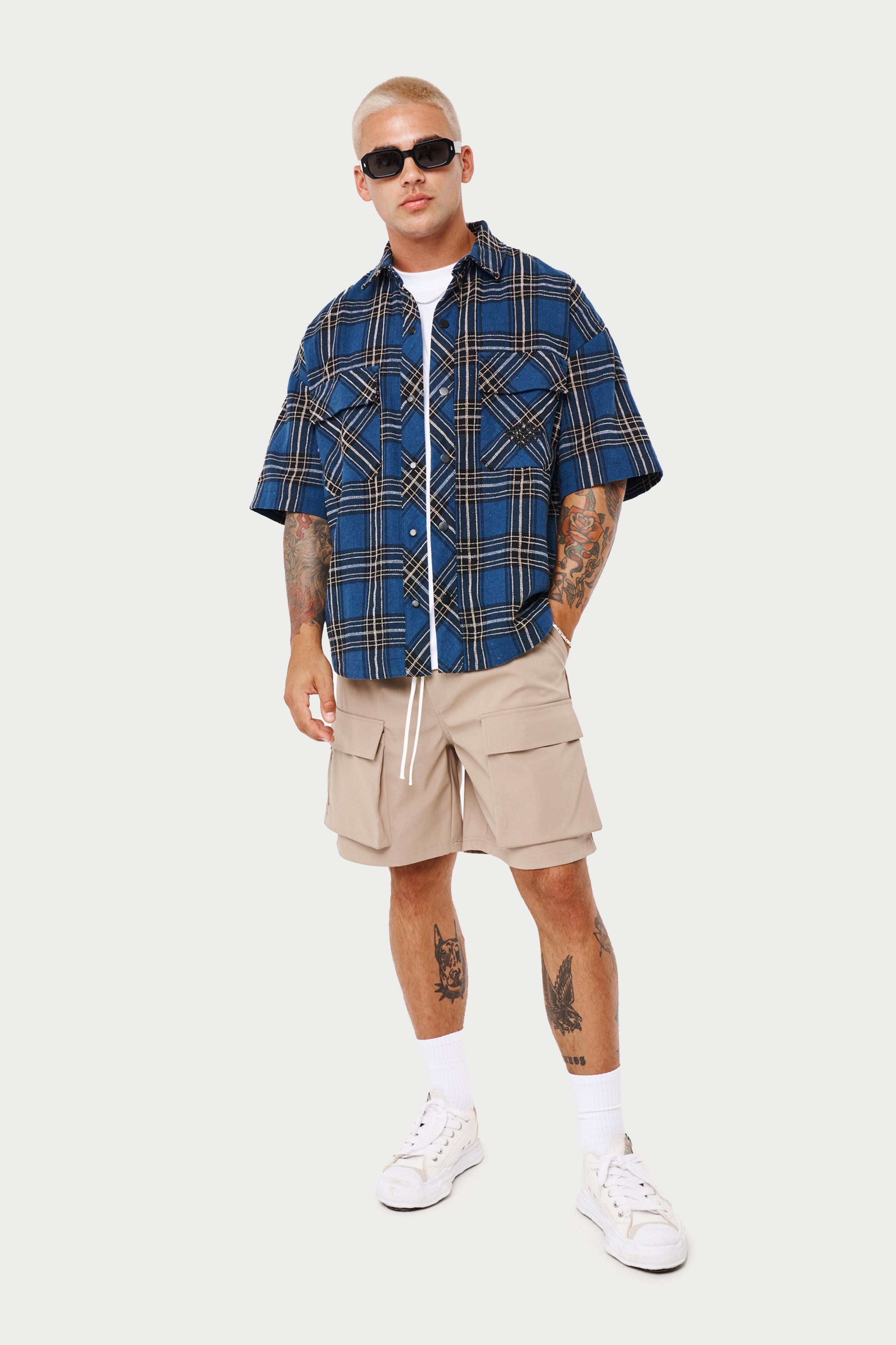 Colour: Blue Details: – Relaxed fit short sleeved shirt with dropped shoulder – Flannel check fabric with padded liner – Embroidery artwork on pocket – Curved hem – Popper fastening to front – Model wears size M and is 5’11, Chest: 38″, Waist 32″ Fabric Composition: Outer: 68% Cotton, 24% Polyester, 8% Viscose. Liner: 100% Polyester. Padding: 100% Polyester
